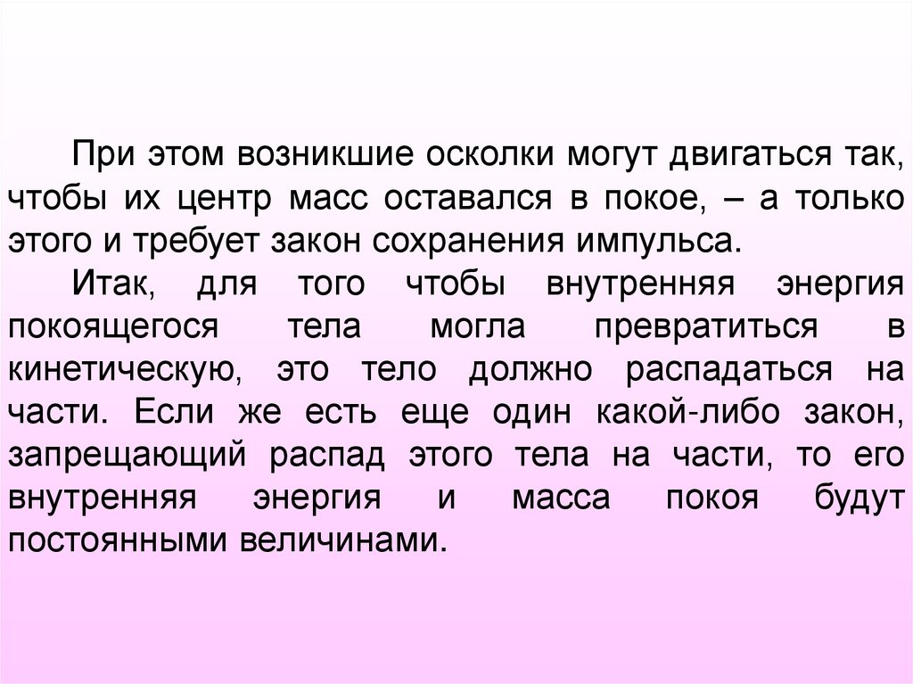 При этом возникшие осколки могут двигаться так,чтобы их центр масс оставался в покое, – а только