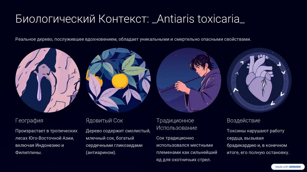Биологический Контекст: _Antiaris toxicaria_Реальное дерево, послужившее вдохновением, обладает уникальными и смертельно опасными свойствами.