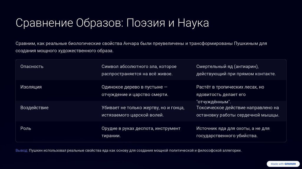Сравнение Образов: Поэзия и НаукаСравним, как реальные биологические свойства Анчара были преувеличены и трансформированы Пушкиным для
