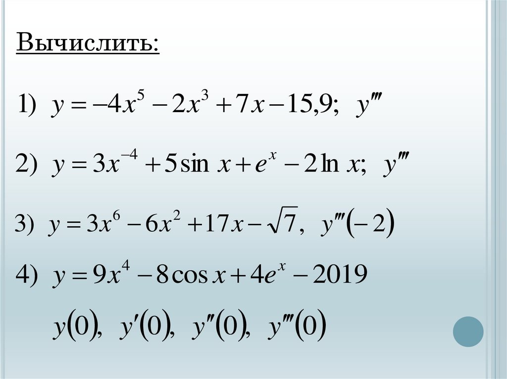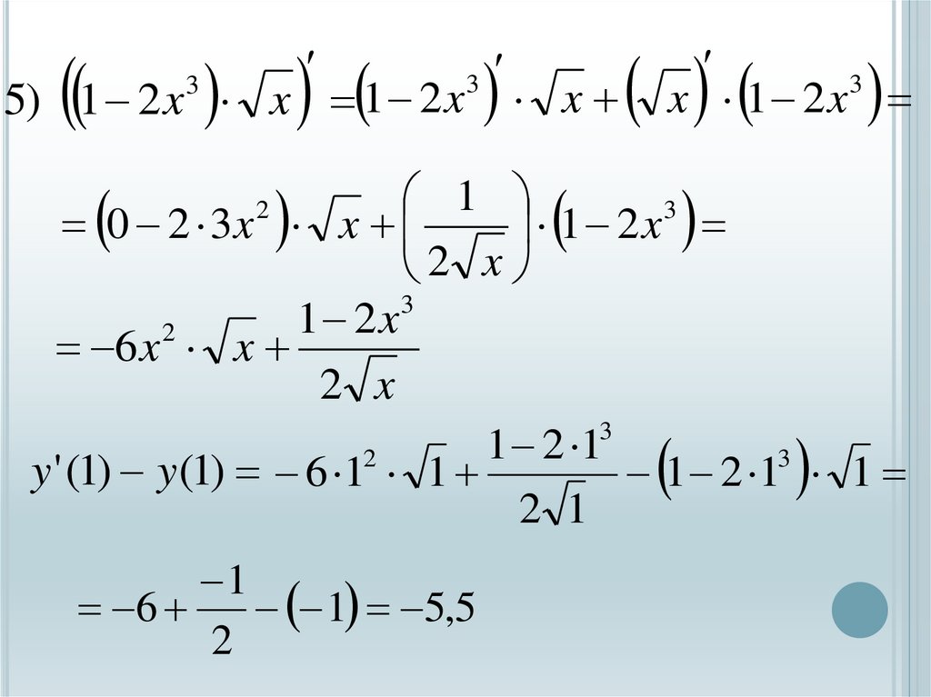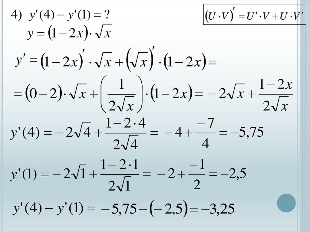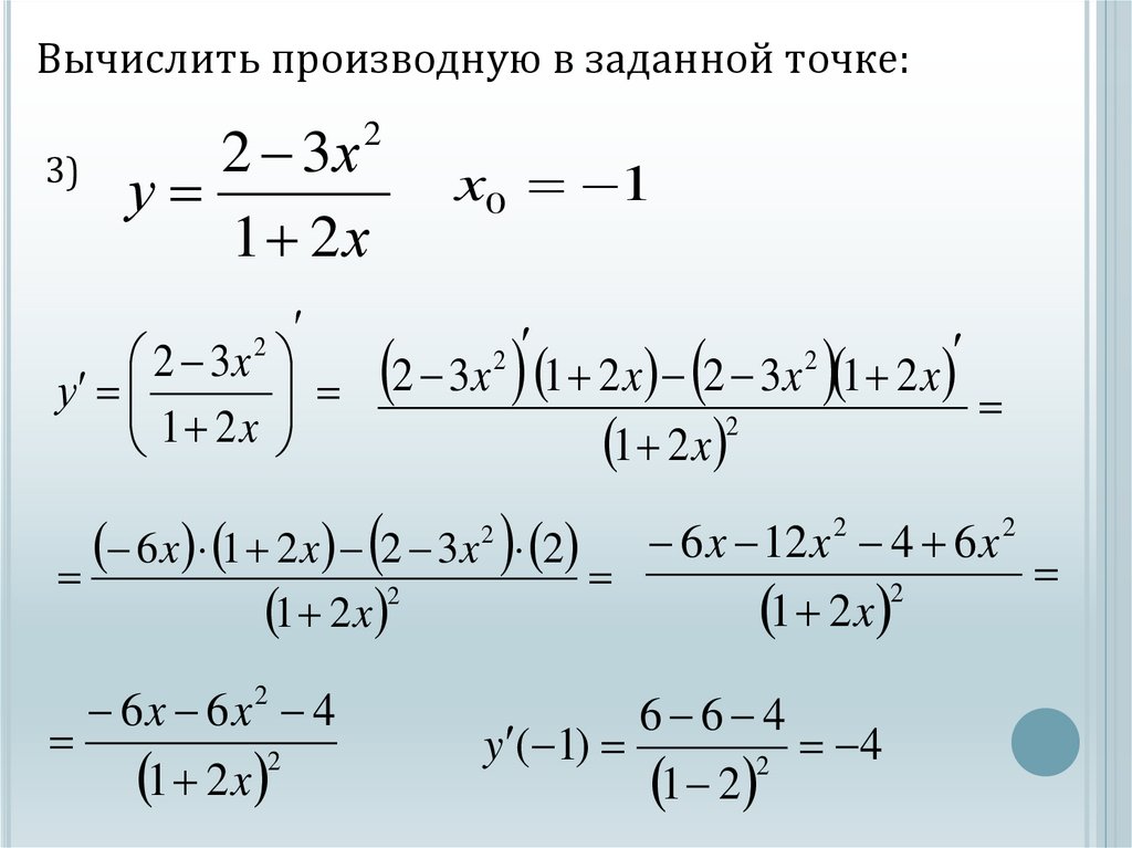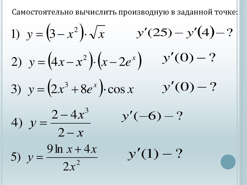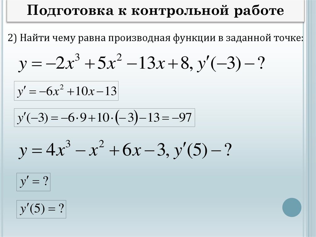 Подготовка к контрольной работе2) Найти чему равна производная функции в заданной точке: