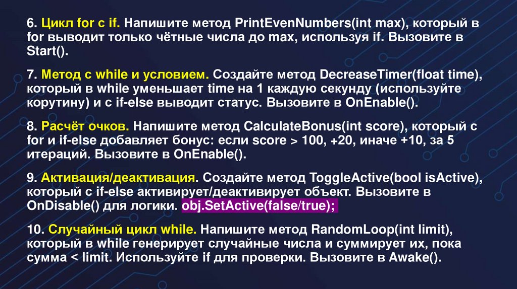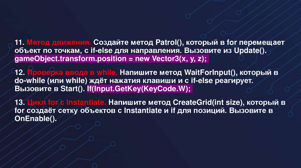 11. Метод движения. Создайте метод Patrol(), который в for перемещаетобъект по точкам, с if-else для направления. Вызовите из Update().