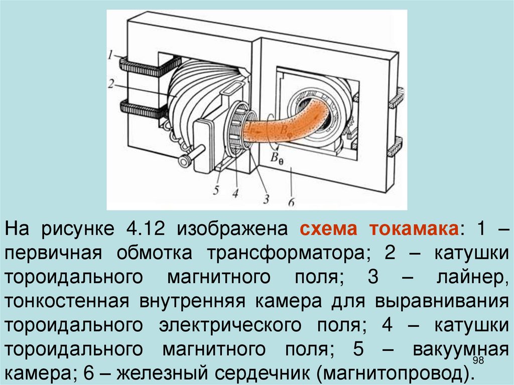 На рисунке 4.12 изображена схема токамака: 1 –первичная обмотка трансформатора; 2 – катушки