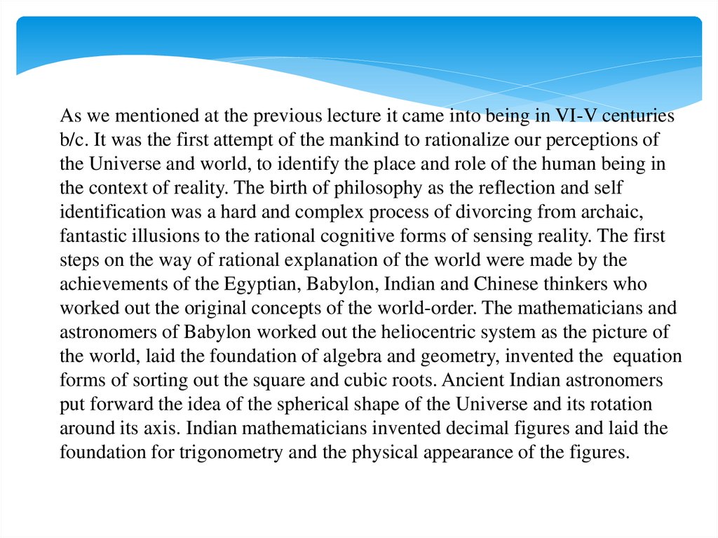 As we mentioned at the previous lecture it came into being in VI-V centuriesb/c. It was the first attempt of the mankind to rationalize our perceptions of