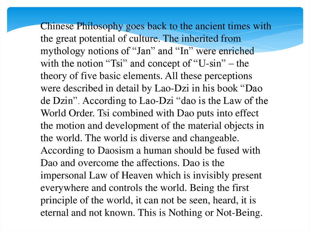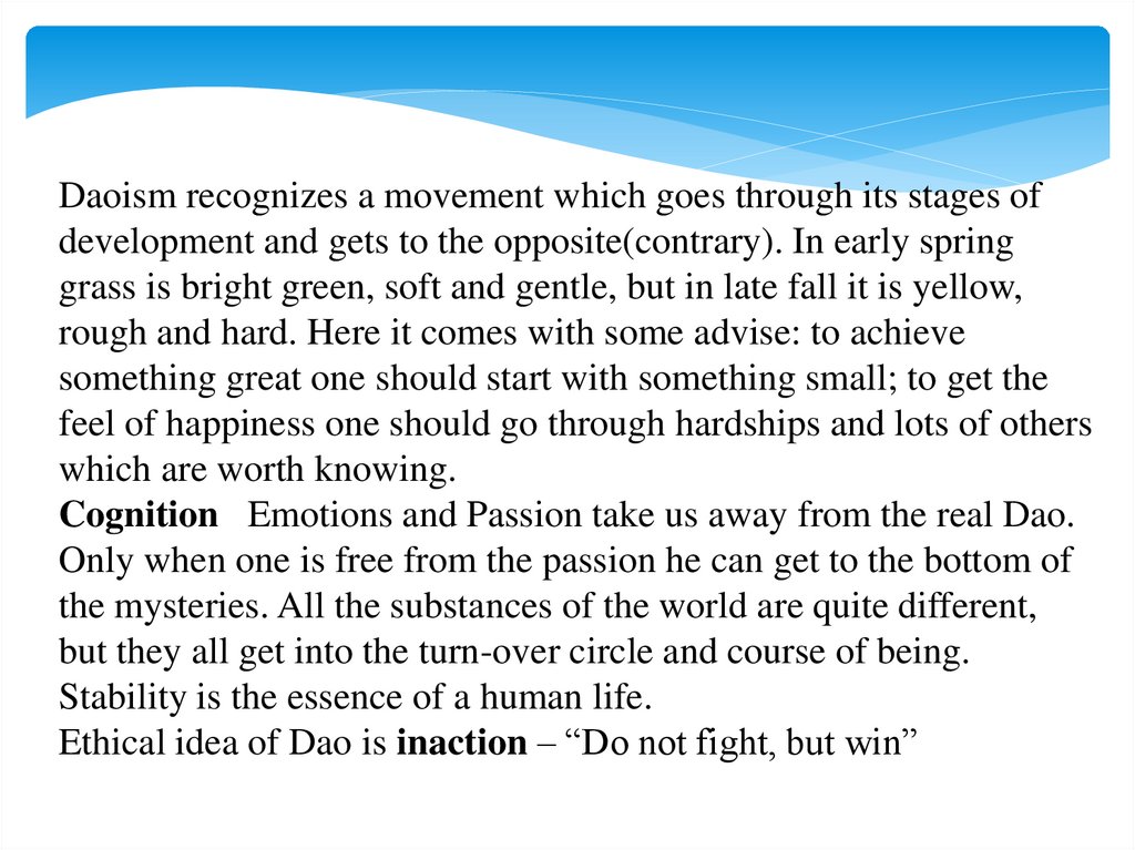 Daoism recognizes a movement which goes through its stages ofdevelopment and gets to the opposite(contrary). In early spring