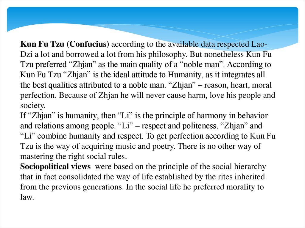 Kun Fu Tzu (Confucius) according to the available data respected LaoDzi a lot and borrowed a lot from his philosophy. But nonetheless Kun FuTzu preferred “Zhjan” as the main quality of a “noble man”. According to