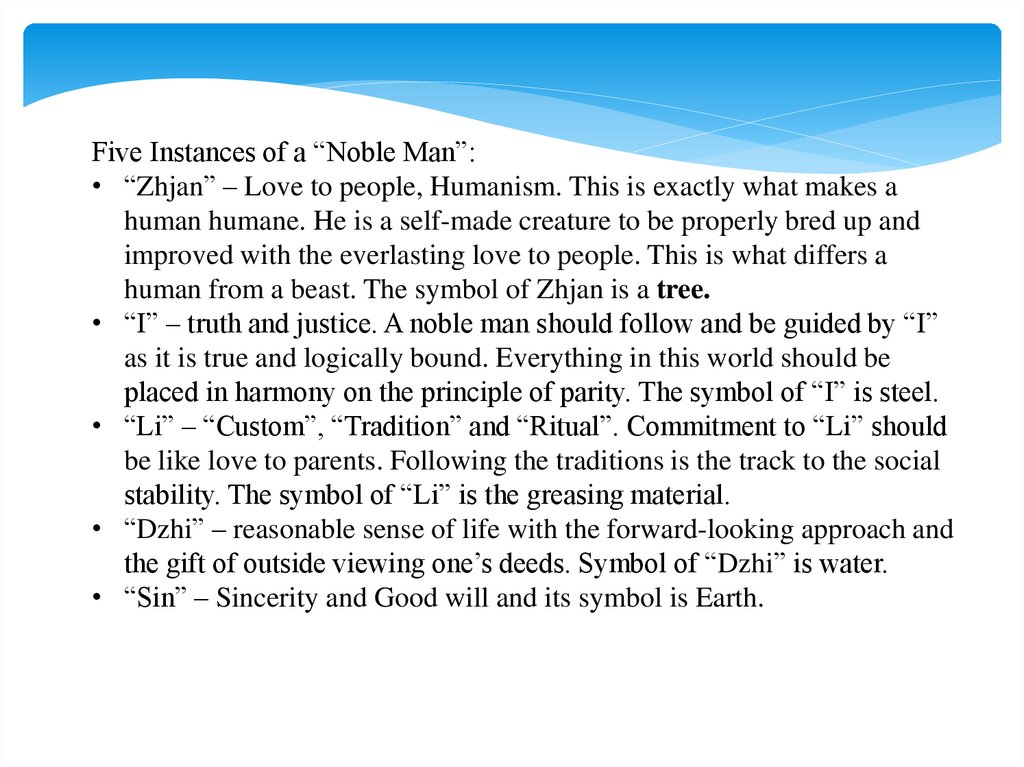 Five Instances of a “Noble Man”:• “Zhjan” – Love to people, Humanism. This is exactly what makes a