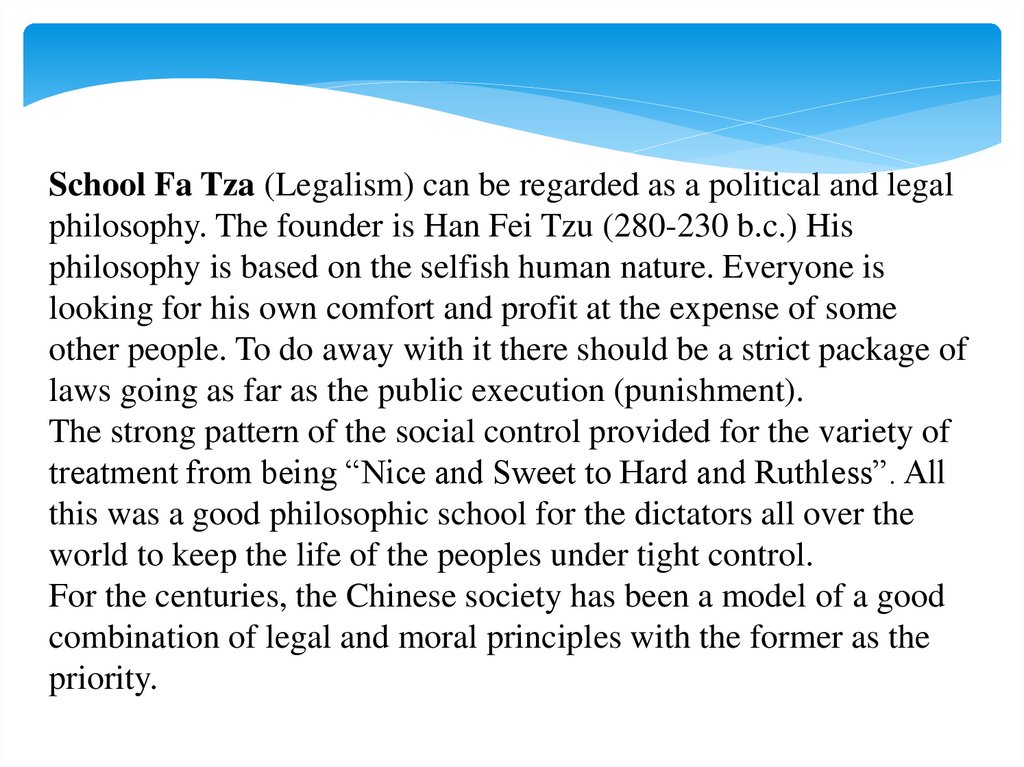 School Fa Tza (Legalism) can be regarded as a political and legalphilosophy. The founder is Han Fei Tzu (280-230 b.c.) His