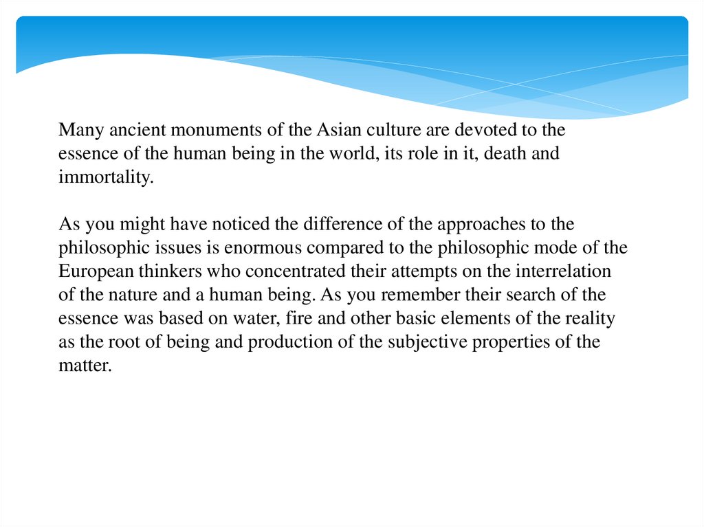 Many ancient monuments of the Asian culture are devoted to theessence of the human being in the world, its role in it, death and