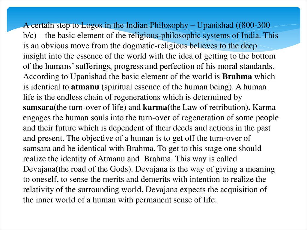 A certain step to Logos in the Indian Philosophy – Upanishad ((800-300b/c) – the basic element of the religious-philosophic systems of India. This