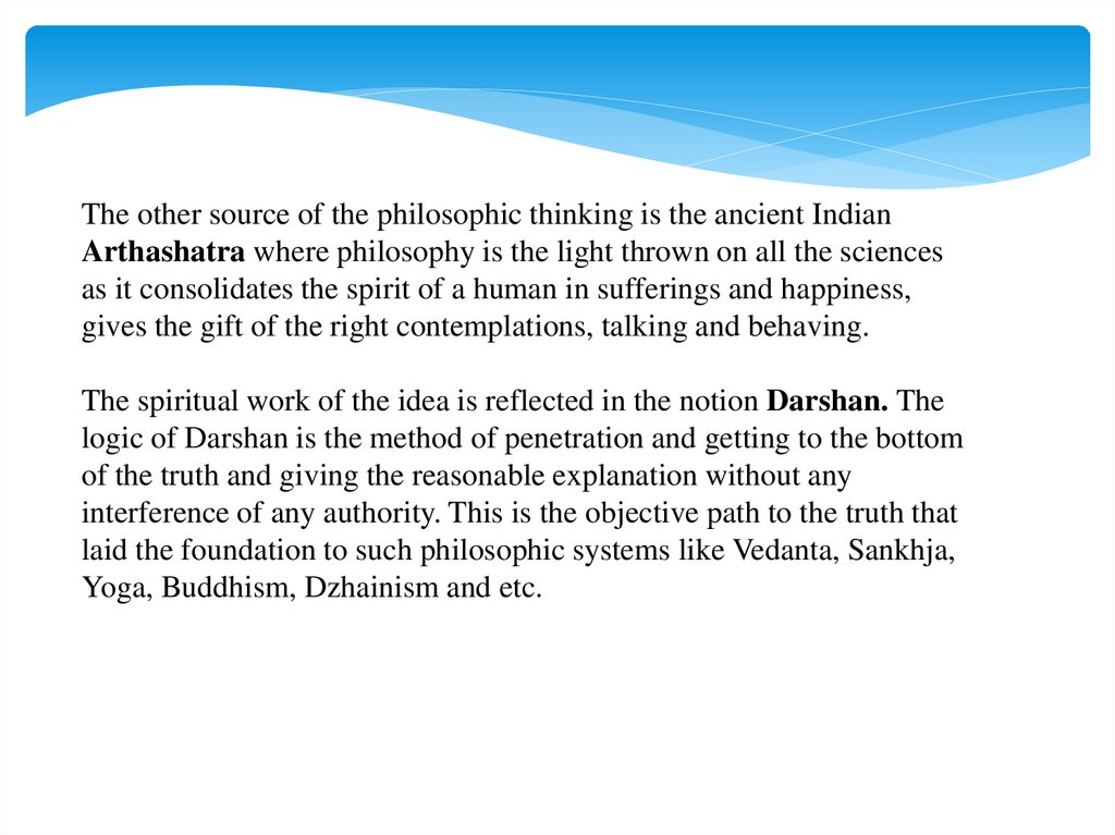 The other source of the philosophic thinking is the ancient IndianArthashatra where philosophy is the light thrown on all the sciences