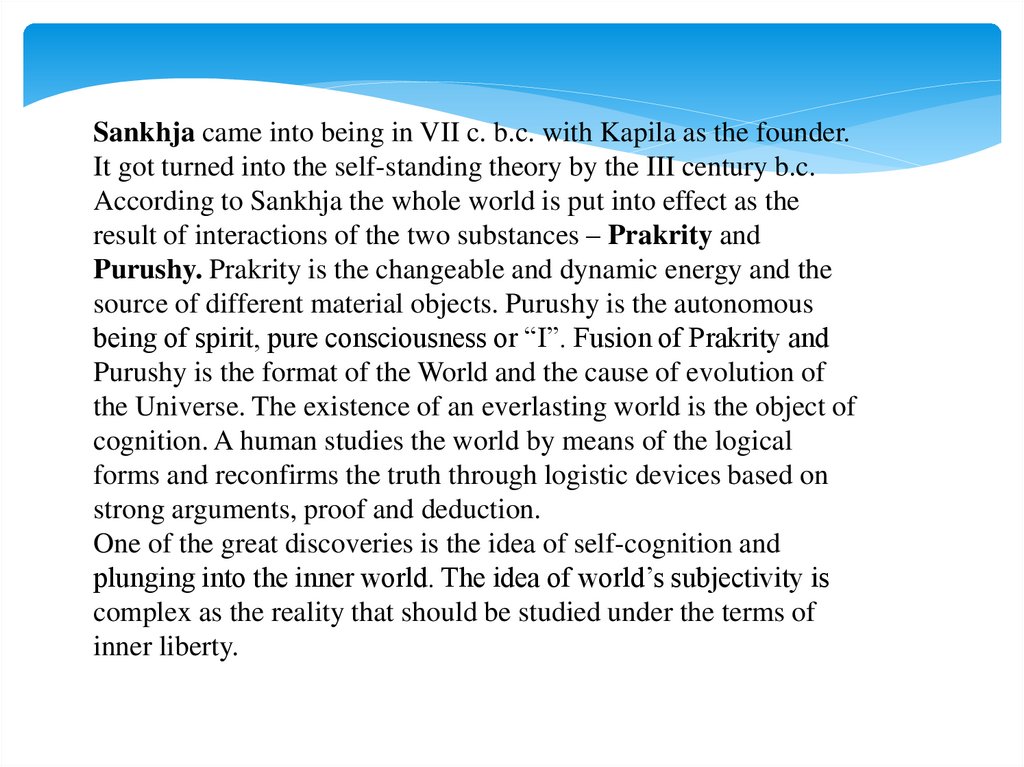 Sankhja came into being in VII c. b.c. with Kapila as the founder.It got turned into the self-standing theory by the III century b.c.