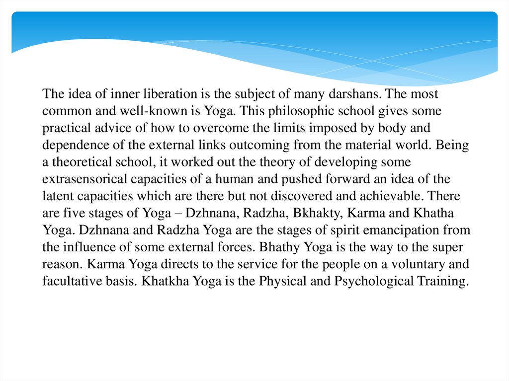The idea of inner liberation is the subject of many darshans. The mostcommon and well-known is Yoga. This philosophic school gives some