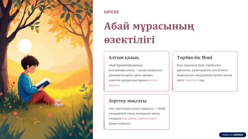 Түйін: Абайдың балаларға арналған өлеңдері – тек көркем туынды ғана емес, жас ұрпаққа бағытталған мәңгілік тәрбие құралы.