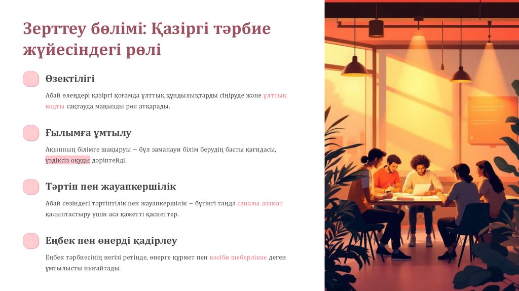 Абайдың мұрасы қазіргі тәрбие жүйесіндегі рухани бағдар ретінде қызмет етеді.