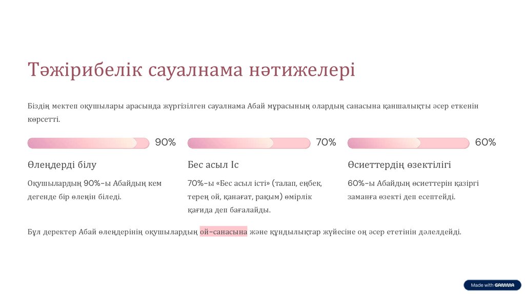 Бұл деректер Абай өлеңдерінің оқушылардың ой-санасына және құндылықтар жүйесіне оң әсер ететінін дәлелдейді.
