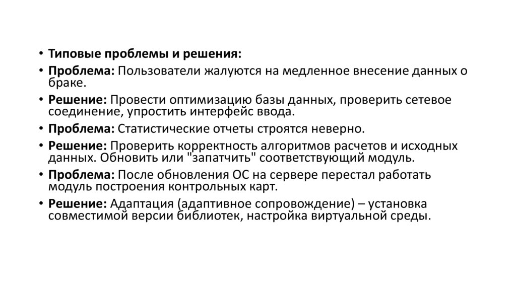 • Типовые проблемы и решения:• Проблема: Пользователи жалуются на медленное внесение данных о