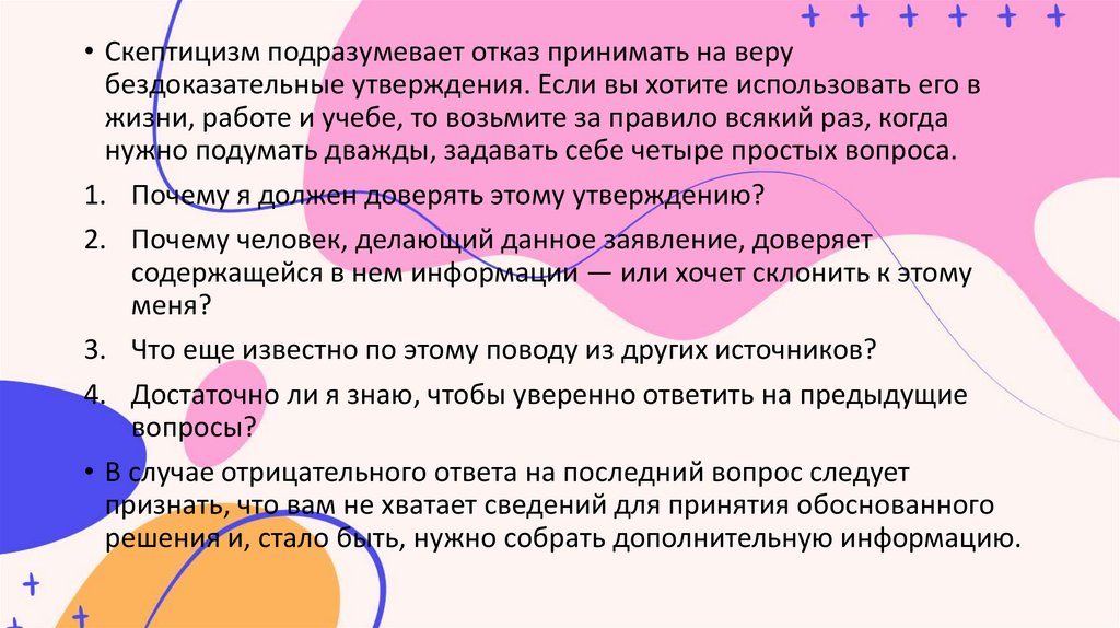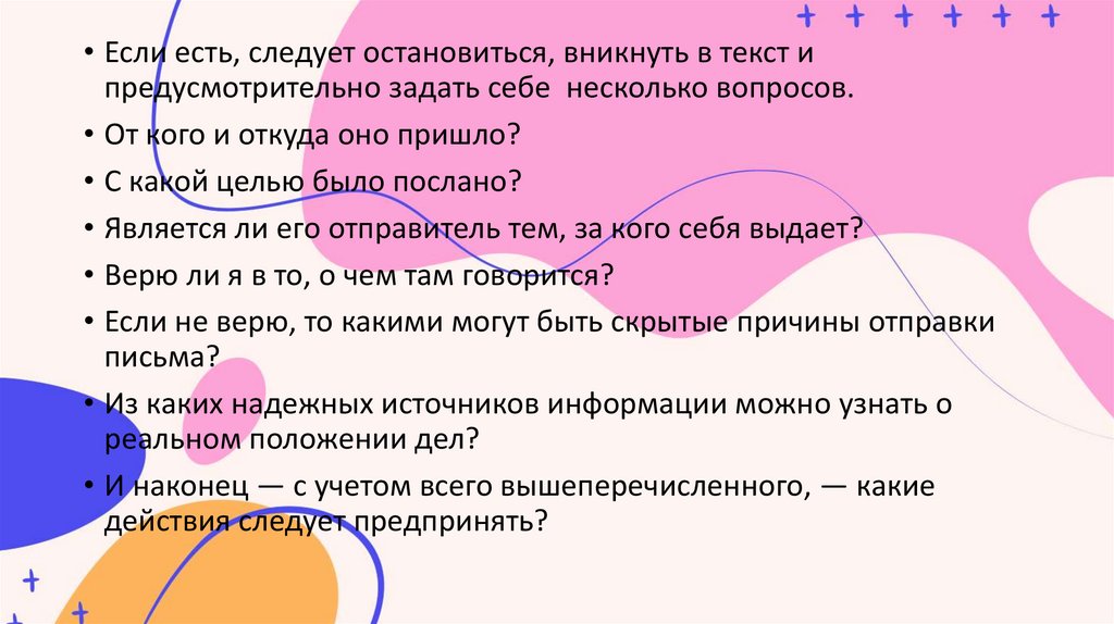 • Если есть, следует остановиться, вникнуть в текст ипредусмотрительно задать себе несколько вопросов.