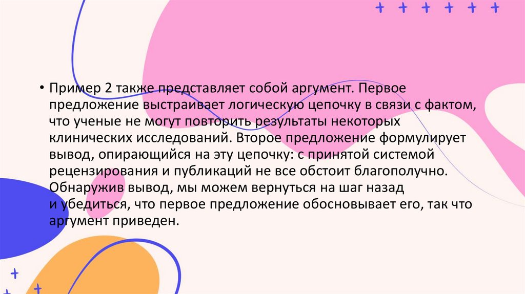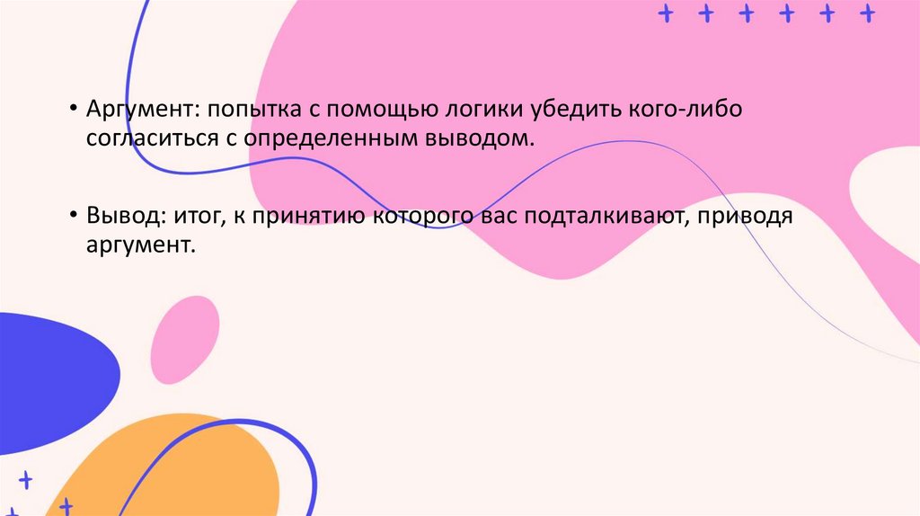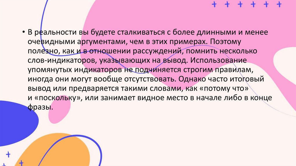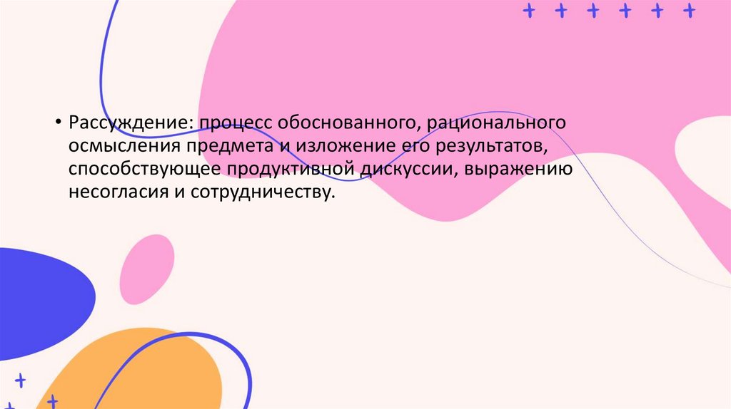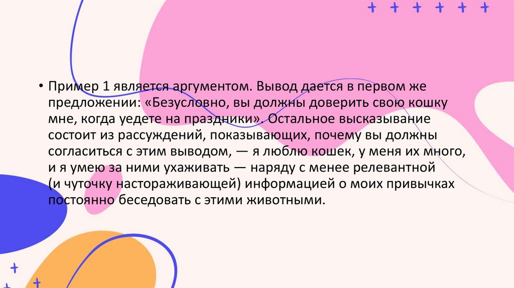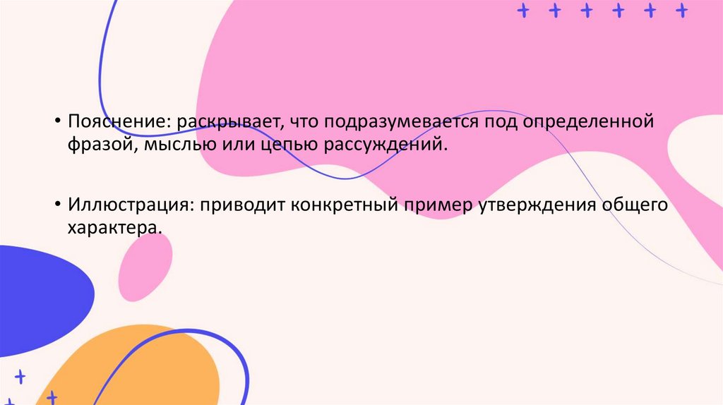 • Пояснение: раскрывает, что подразумевается под определеннойфразой, мыслью или цепью рассуждений.