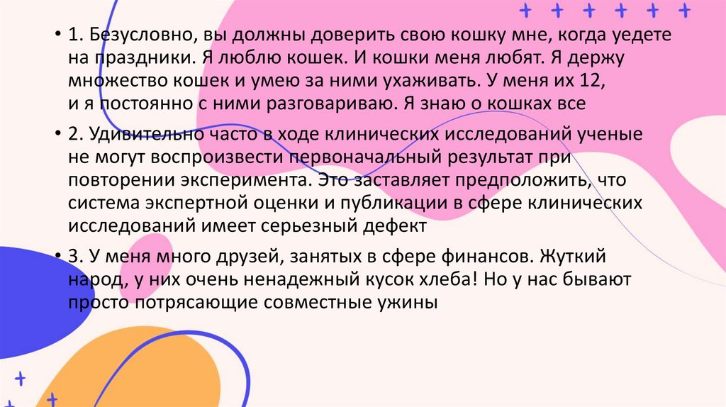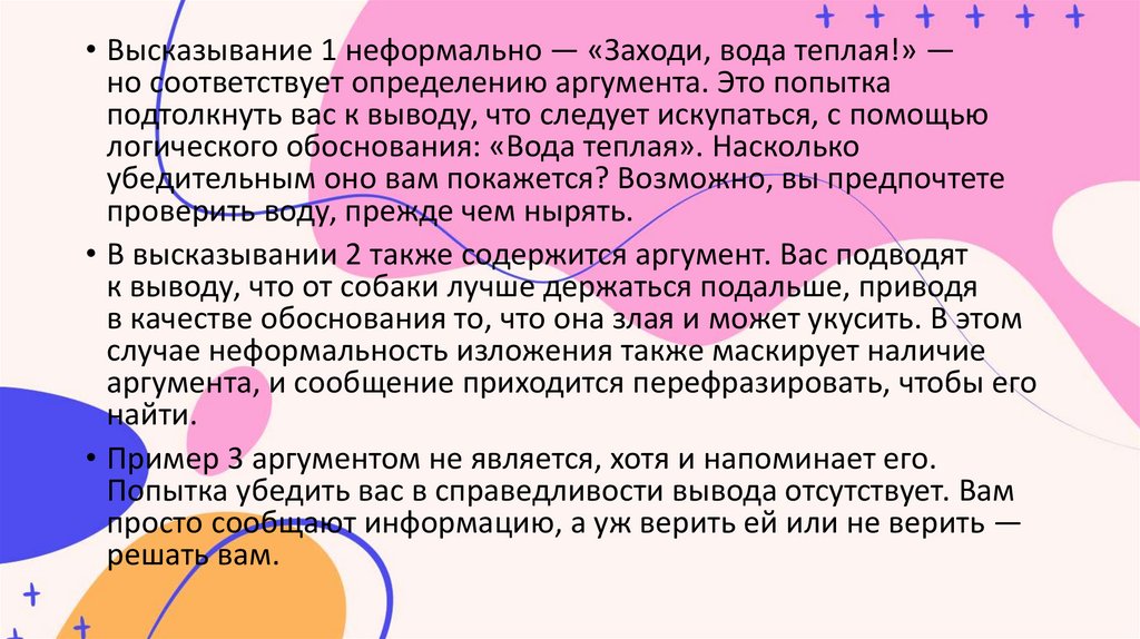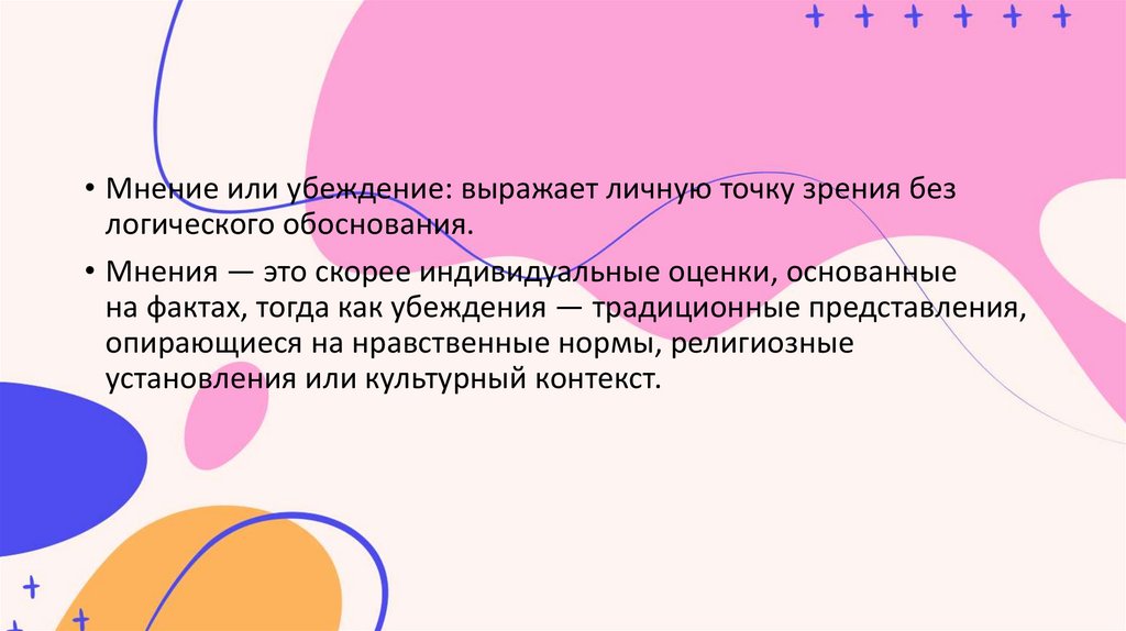• Мнение или убеждение: выражает личную точку зрения безлогического обоснования.