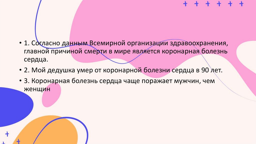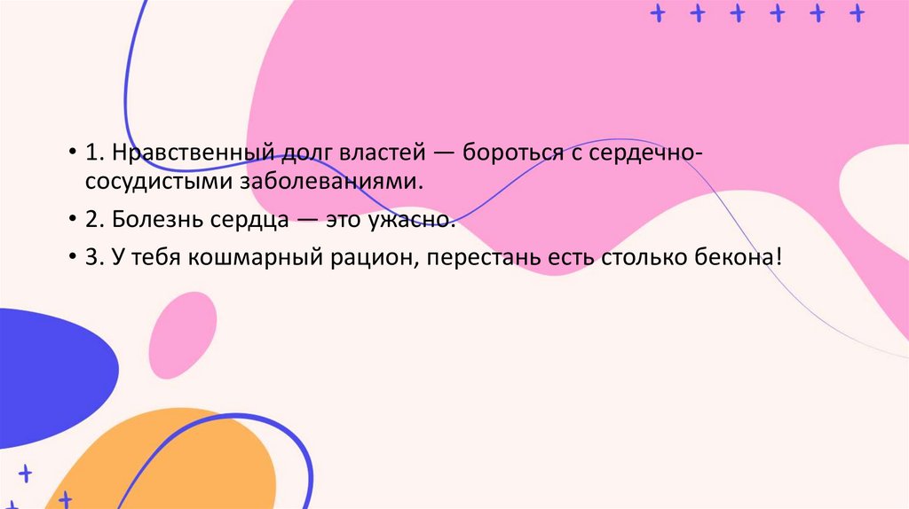 • 1. Нравственный долг властей — бороться с сердечнососудистыми заболеваниями.• 2. Болезнь сердца — это ужасно.