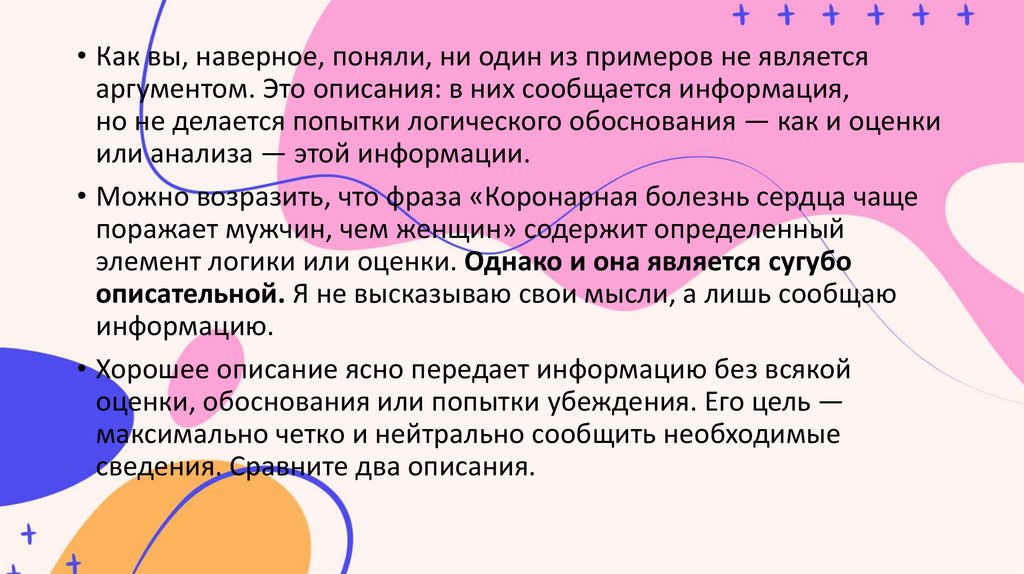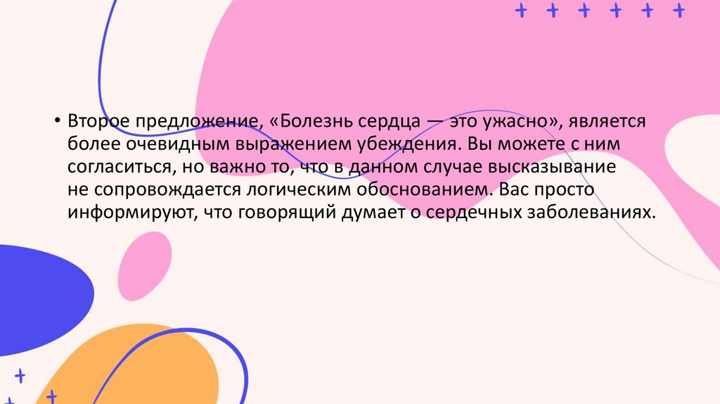 • Второе предложение, «Болезнь сердца — это ужасно», являетсяболее очевидным выражением убеждения. Вы можете с ним