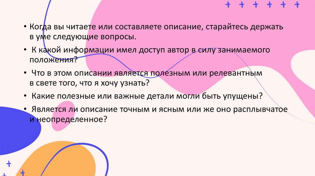 • Когда вы читаете или составляете описание, старайтесь держатьв уме следующие вопросы.