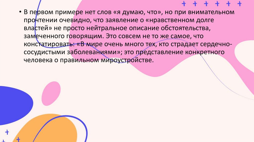 • В первом примере нет слов «я думаю, что», но при внимательномпрочтении очевидно, что заявление о «нравственном долге