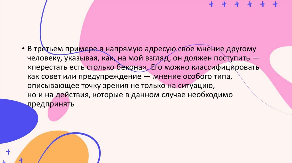• В третьем примере я напрямую адресую свое мнение другомучеловеку, указывая, как, на мой взгляд, он должен поступить —