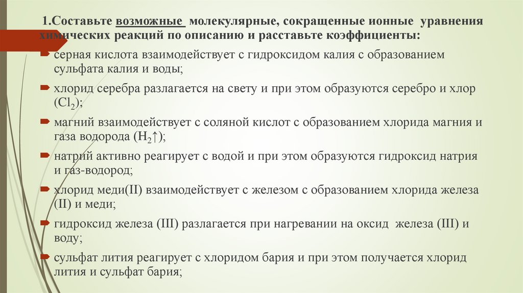 1.Составьте возможные молекулярные, сокращенные ионные уравненияхимических реакций по описанию и расставьте коэффициенты: