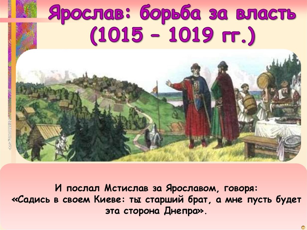И послал Мстислав за Ярославом, говоря:«Садись в своем Киеве: ты старший брат, а мне пусть будет