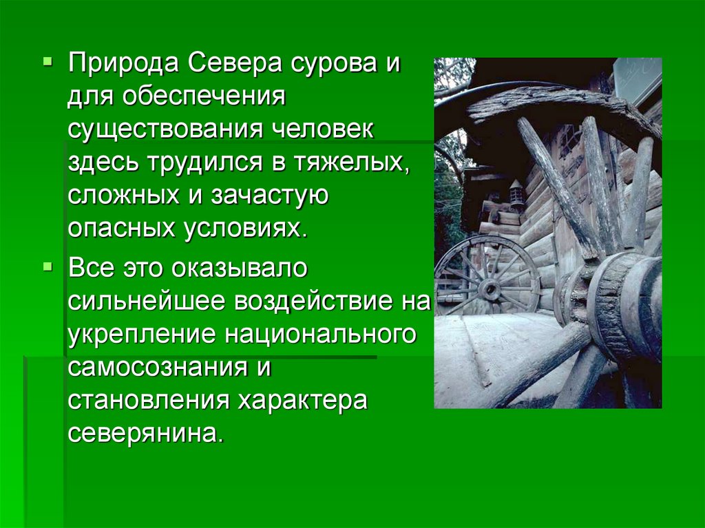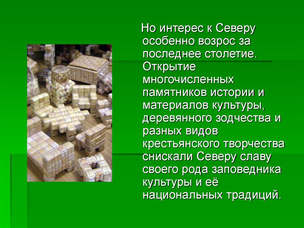 3. Условия жизни на севере в далеком прошлом способствовали выявлению художественных сил народа, так как здесь отсутствовала