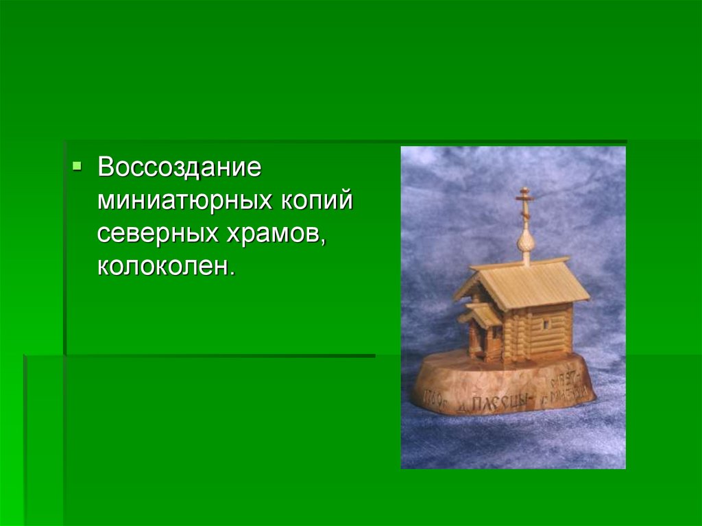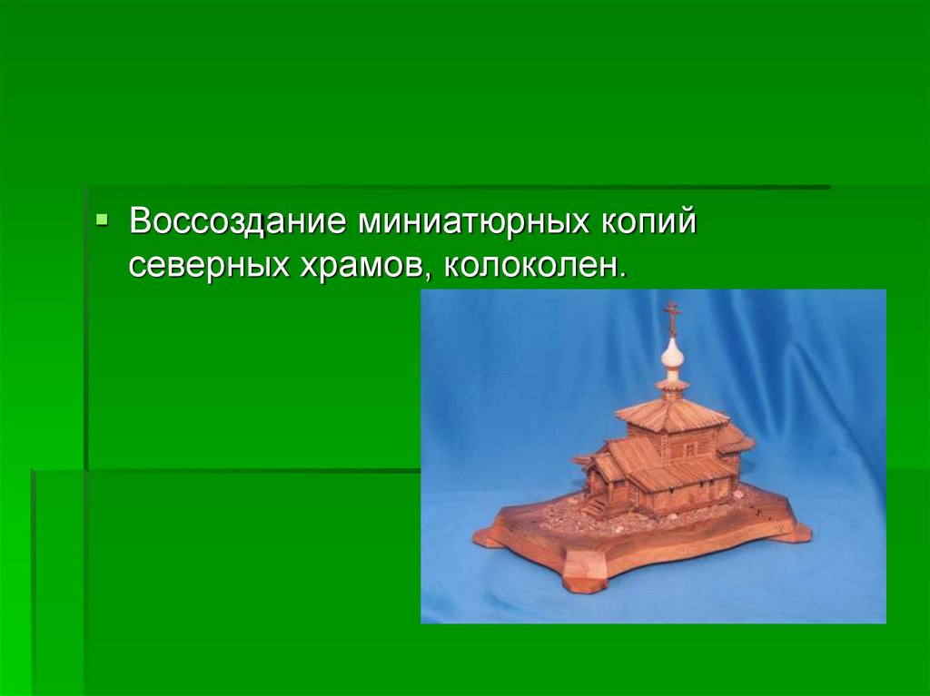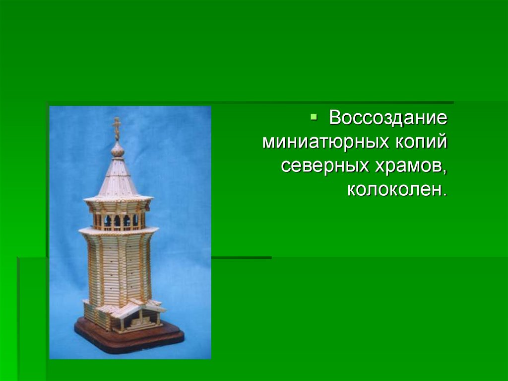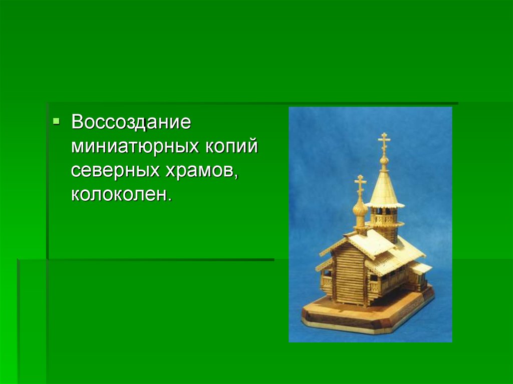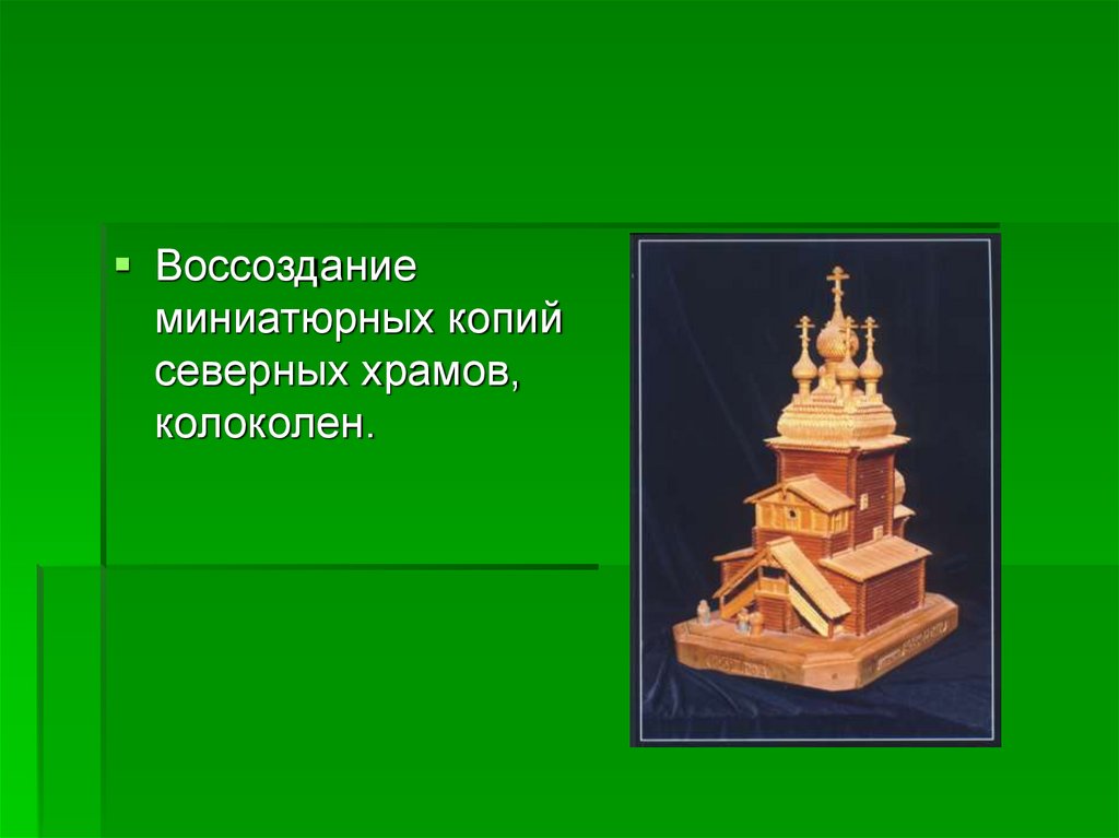 Воссоздание миниатюрных копийсеверных храмов, колоколен.