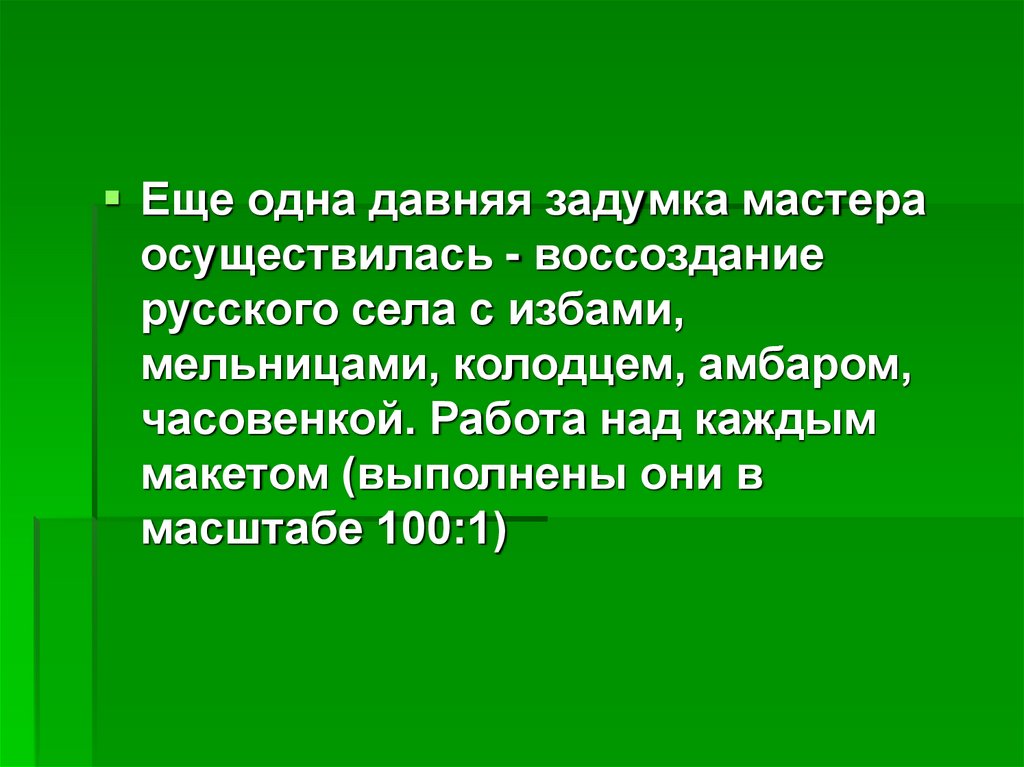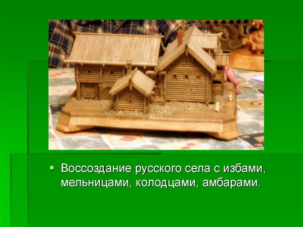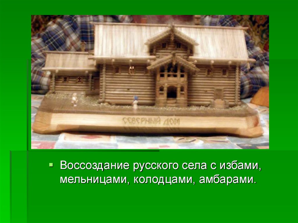 Воссоздание русского села с избами,мельницами, колодцами, амбарами.