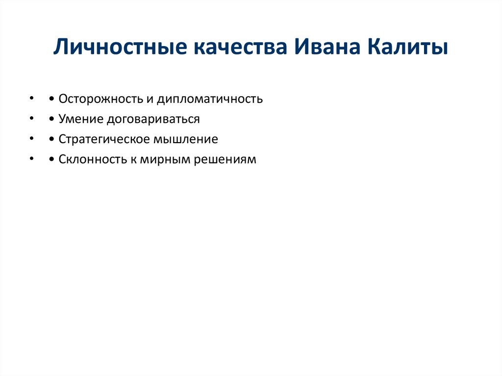 Личностные качества Ивана Калиты• Осторожность и дипломатичность