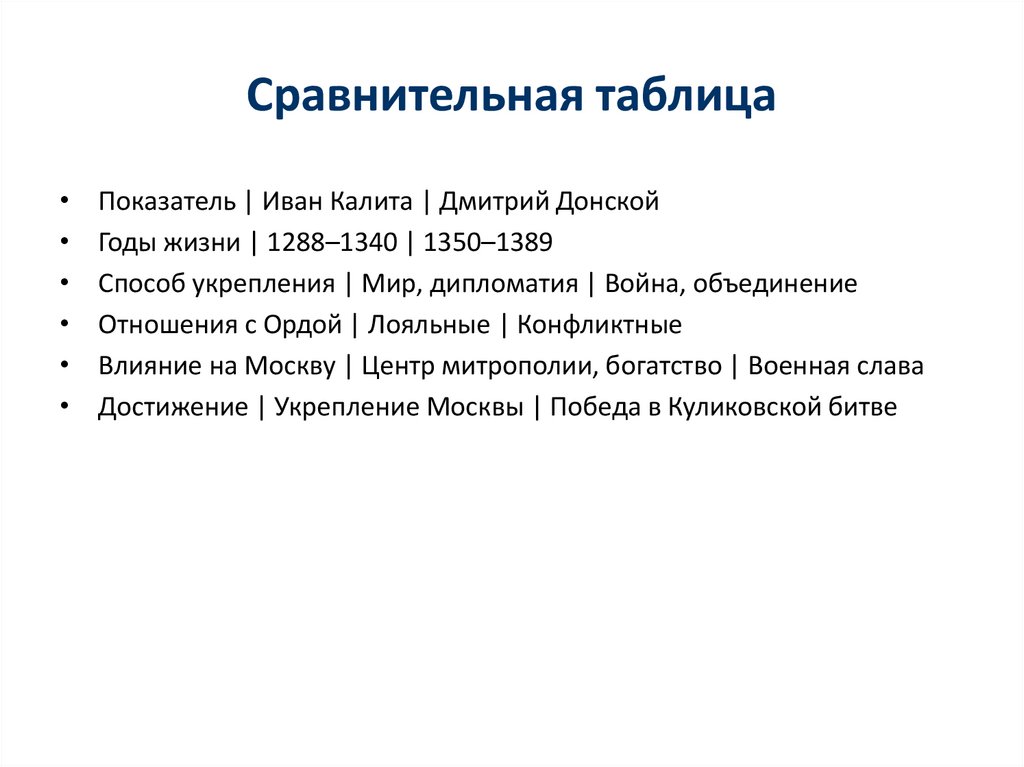 Сравнительная таблицаПоказатель | Иван Калита | Дмитрий Донской