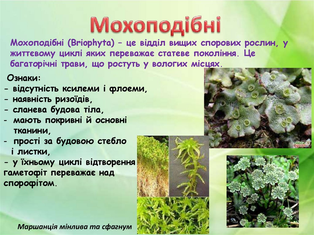 Мохоподібні (Briophyta) – це відділ вищих спорових рослин, ужиттєвому циклі яких переважає статеве покоління. Це