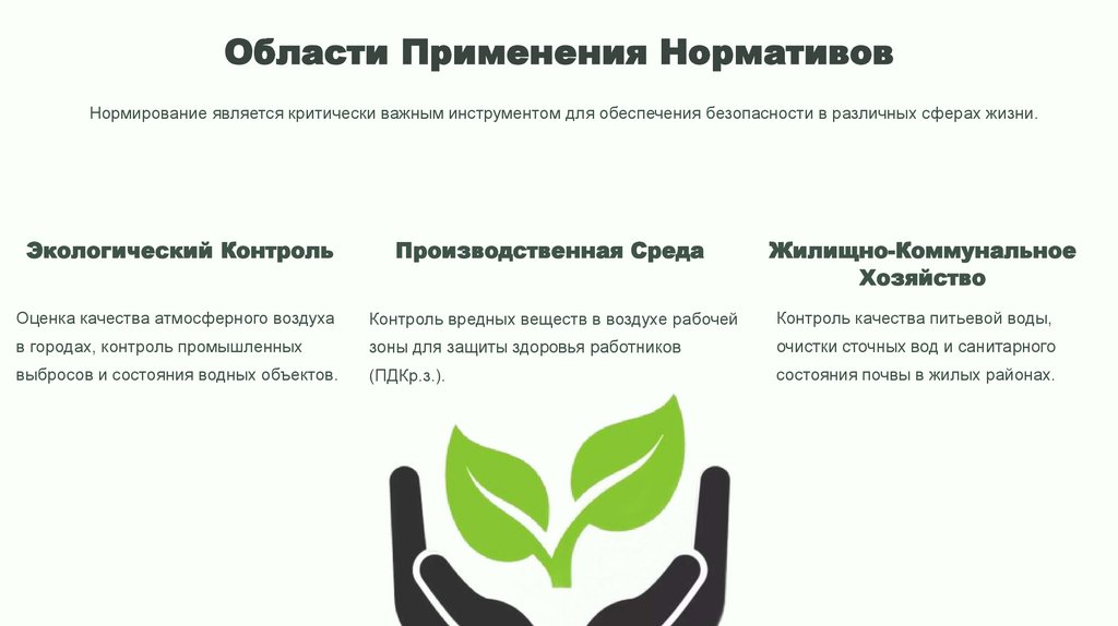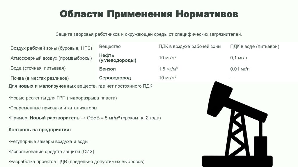 Области Применения НормативовЗащита здоровья работников и окружающей среды от специфических загрязнителей.
