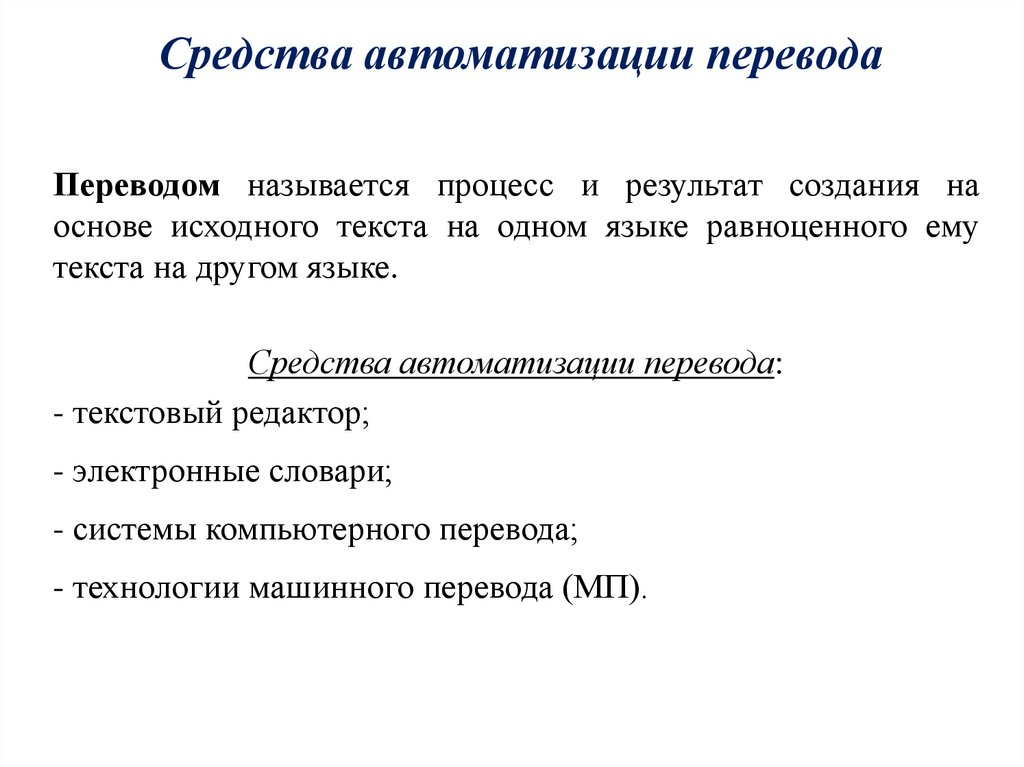 Средства автоматизации переводаПереводом называется процесс и результат создания на