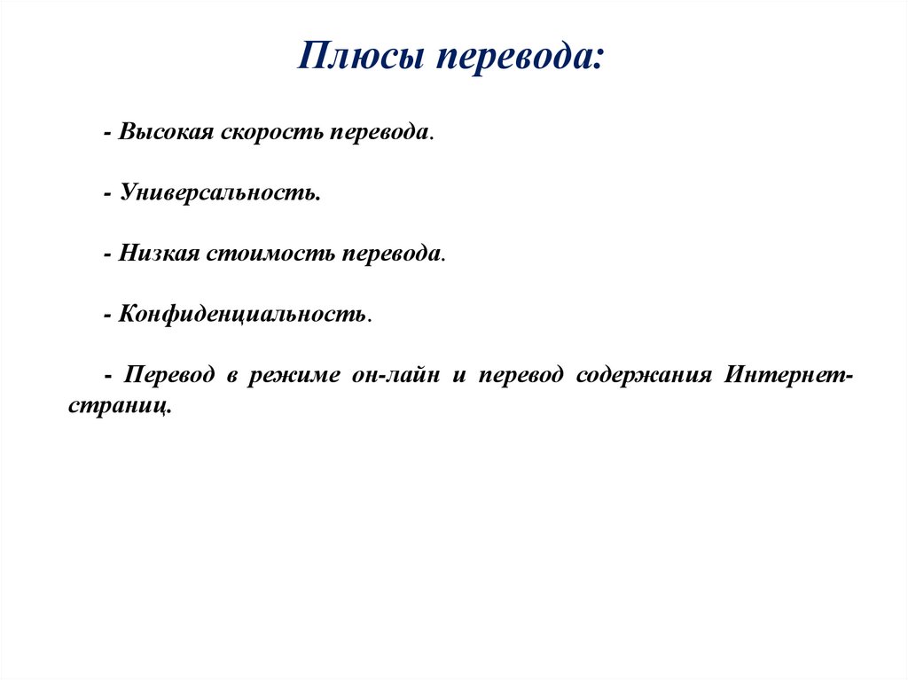 Плюсы перевода:- Высокая скорость перевода.