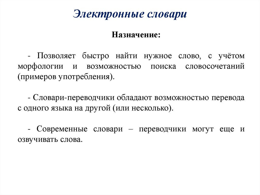 - Словари-переводчики обладают возможностью перевода