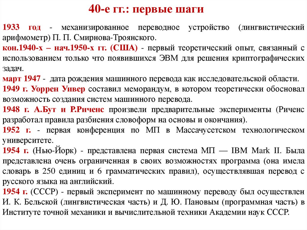 40-е гг.: первые шаги1933 год - механизированное переводное устройство (лингвистический