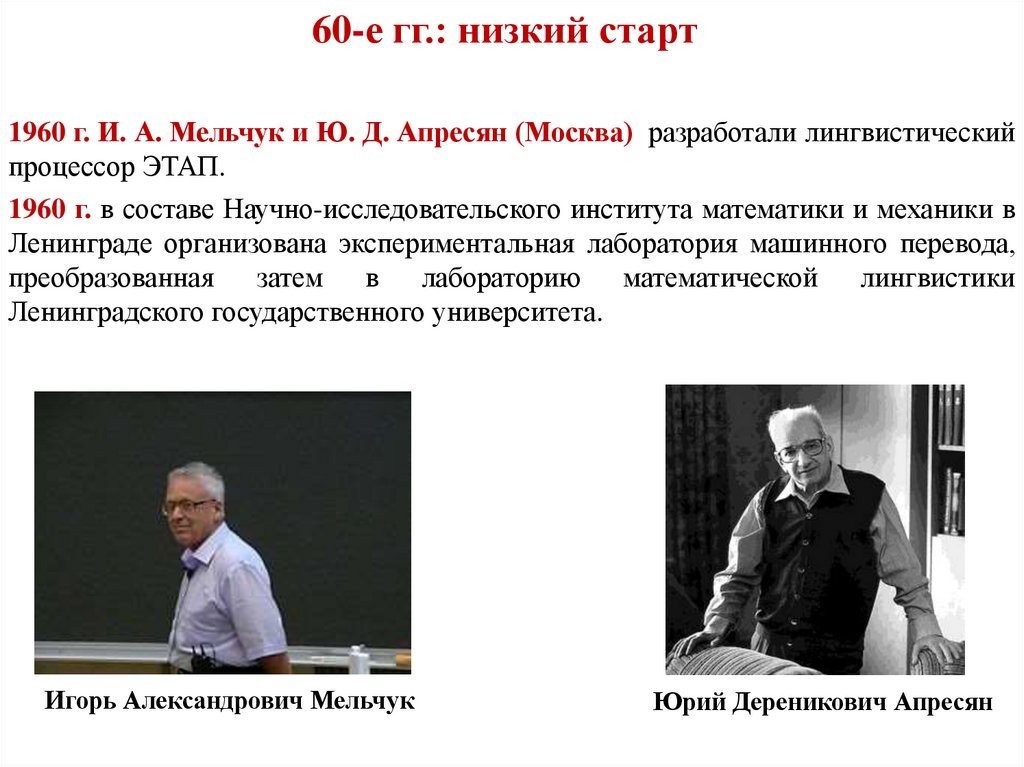 60-е гг.: низкий старт1960 г. И. А. Мельчук и Ю. Д. Апресян (Москва) разработали лингвистический