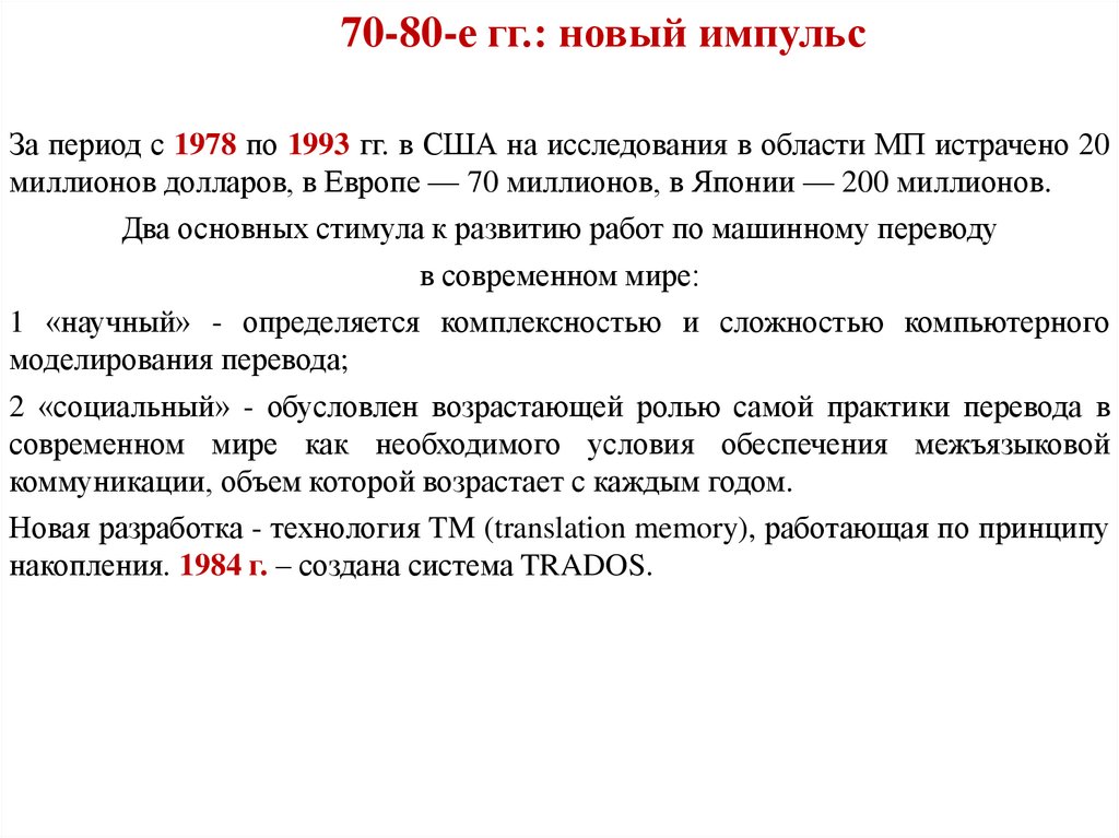 70-80-е гг.: новый импульсЗа период с 1978 по 1993 гг. в США на исследования в области МП истрачено 20