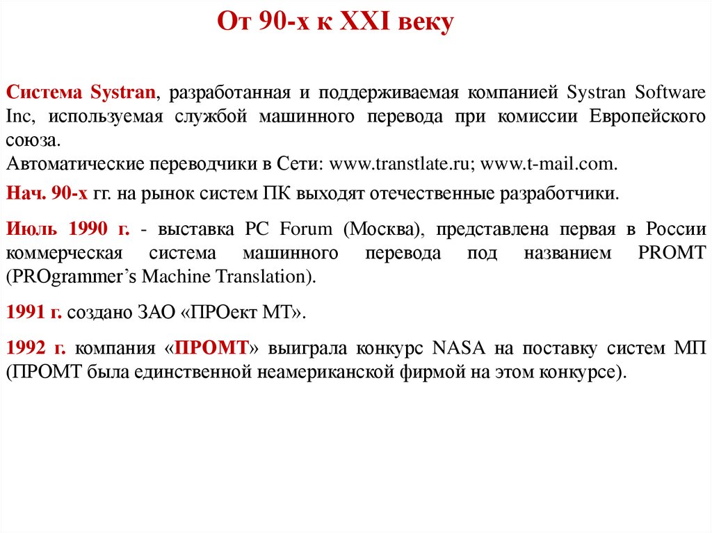 От 90-х к XXI векуСистема Systran, разработанная и поддерживаемая компанией Systran Software