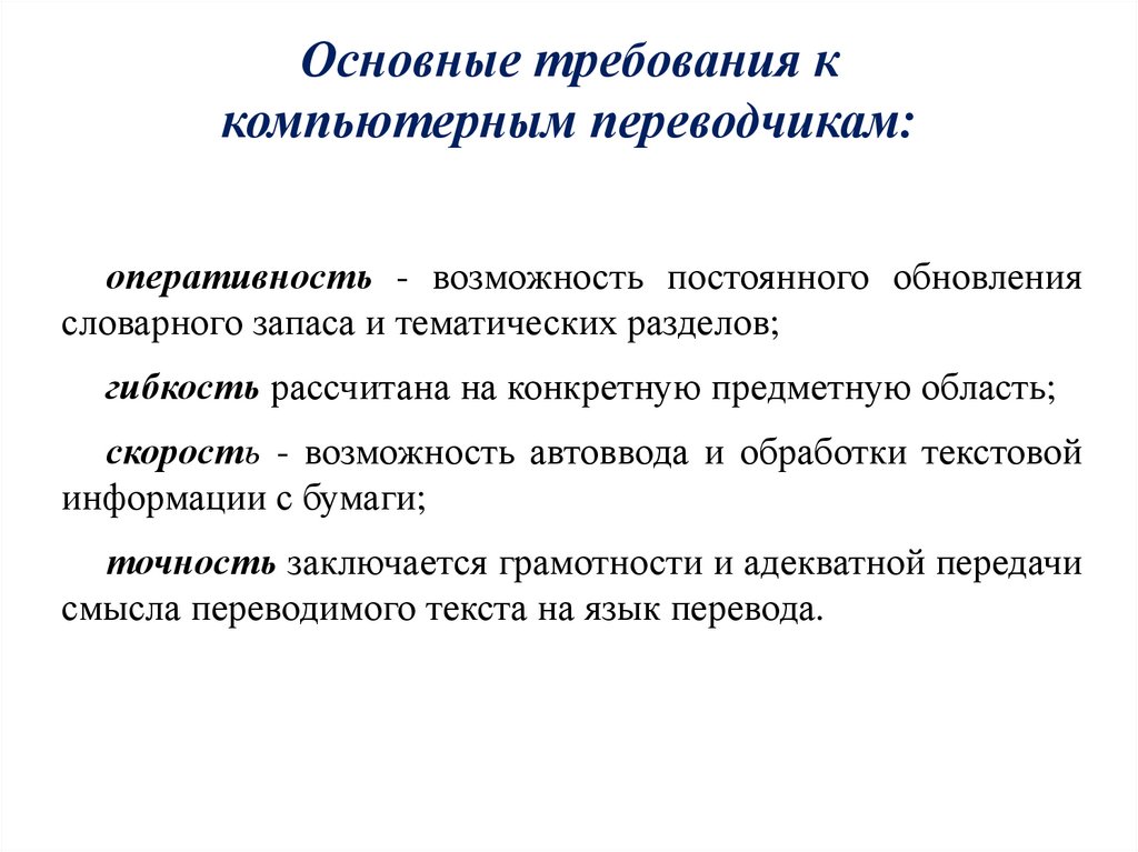 Основные требования ккомпьютерным переводчикам:
