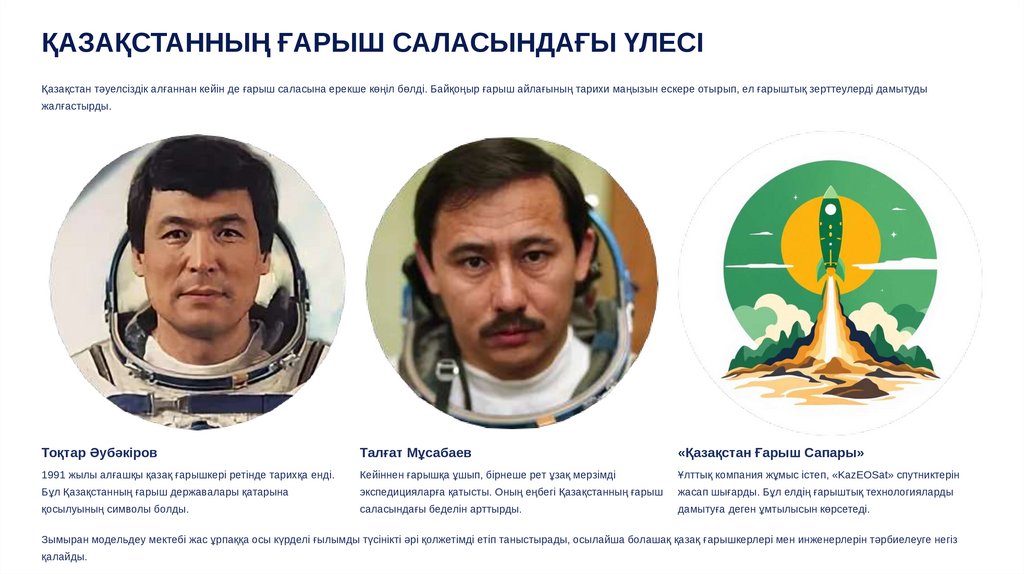 ҚАЗАҚСТАННЫҢ ҒАРЫШ САЛАСЫНДАҒЫ ҮЛЕСІҚазақстан тәуелсіздік алғаннан кейін де ғарыш саласына ерекше көңіл бөлді. Байқоңыр ғарыш айлағының тарихи маңызын ескере отырып, ел ғарыштық зерттеулерді дамытуды