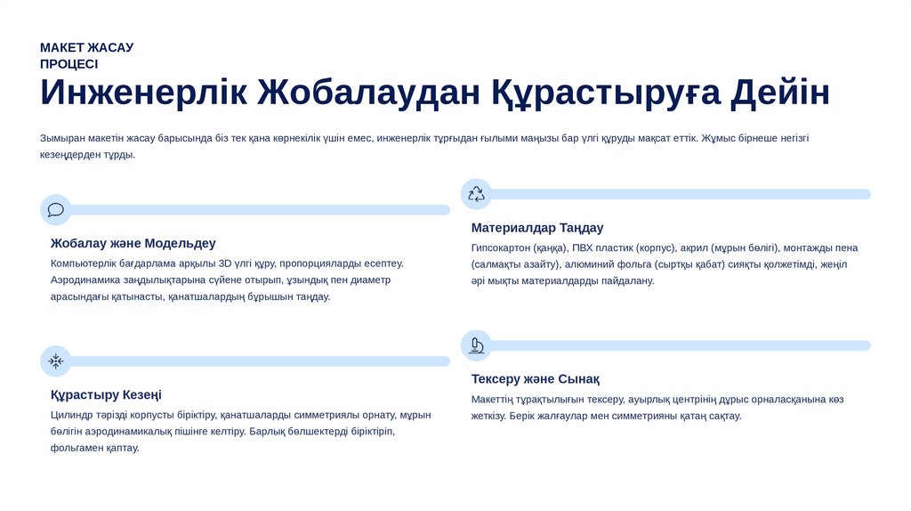 • Тәжірибелік сынақ: Макеттің тепе-теңдігін, тұрақтылығын тексеру.