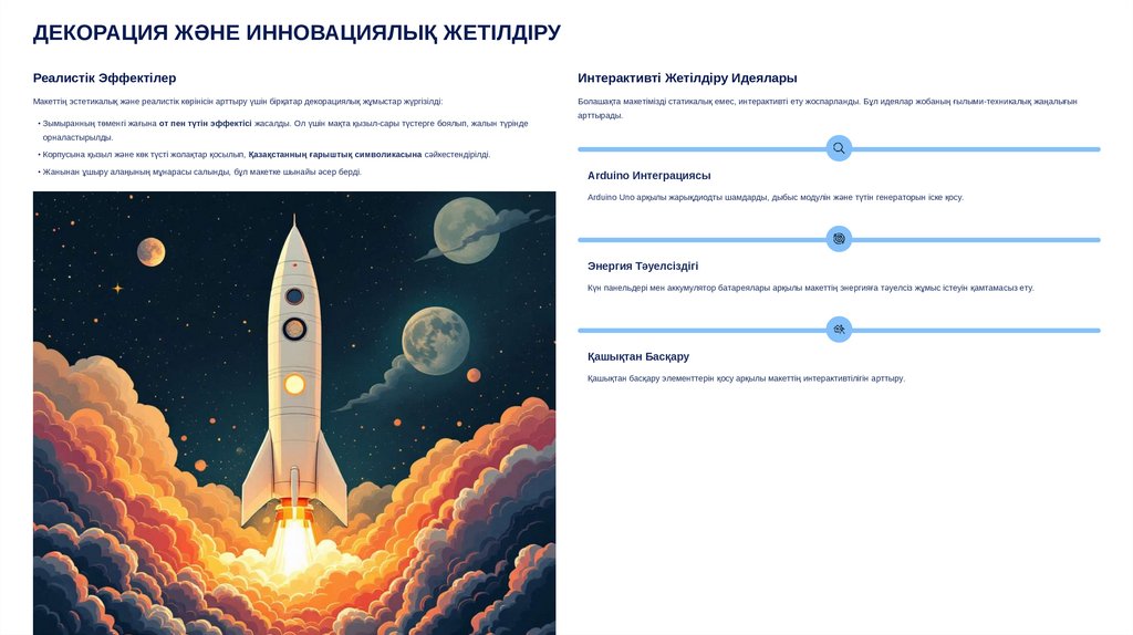 Біздің жобамыздың негізгі жаңалығы – зымыран макетін дәстүрлі көрнекілік деңгейінен шығарып, оны заманауи технологиялармен