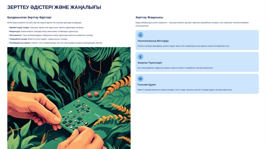 • Инновациялық ізденіс: Arduino, түтін генераторлары мен күн панельдерін қолдану мүмкіндіктерін зерттеу.