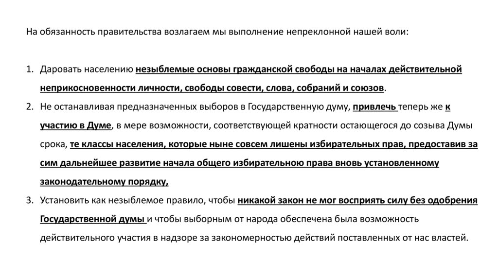На обязанность правительства возлагаем мы выполнение непреклонной нашей воли:1. Даровать населению незыблемые основы гражданской свободы на началах действительной